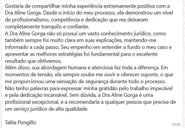 O escritório AG Advocacia é liderado pela advogada Aline Giovanna Gorga (OAB/SP 387.735), com 15 anos de experiência no Direito e sólida formação acadêmica, incluindo pós-graduação em Direito do Trabalho, Processo do Trabalho e Psicologia Forense.